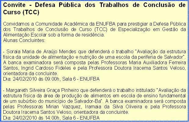 > > | ENUFBA realiza mais uma sessão de defesa pública dos Trabalhos de Conclusão de Curso (TCC) de Especialização em Gestão da Alimentação EscolarRecursos para segurança alimentar aumentam 36%![]() |