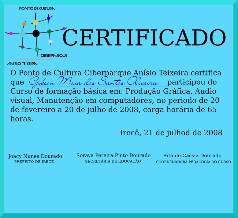 O MEC e o Ministério das Comunicação, organiza esta capacitação para os monitores do Território da cidade de Irecê, Itaguaçu, Central, Canarana, Ibipeba, Lapão, São Gabriel, Presidente Dutra, Cafarnaum, América Dourada, Jussara e Barro Alto Território da Chapada as cidades: Palmeiras, Barra do Mendes e Morro do Chapéu. O Curso está sendo ministrado pelo Professor Cleiton Rodrigues de Souza, técnico em informática do Instituto Federal do Sertão pernambucano, situado em Petrolina - PE, e graduando em Análise de Sistema. Atualmente atua também como coordenador de serviços de informática e rede.