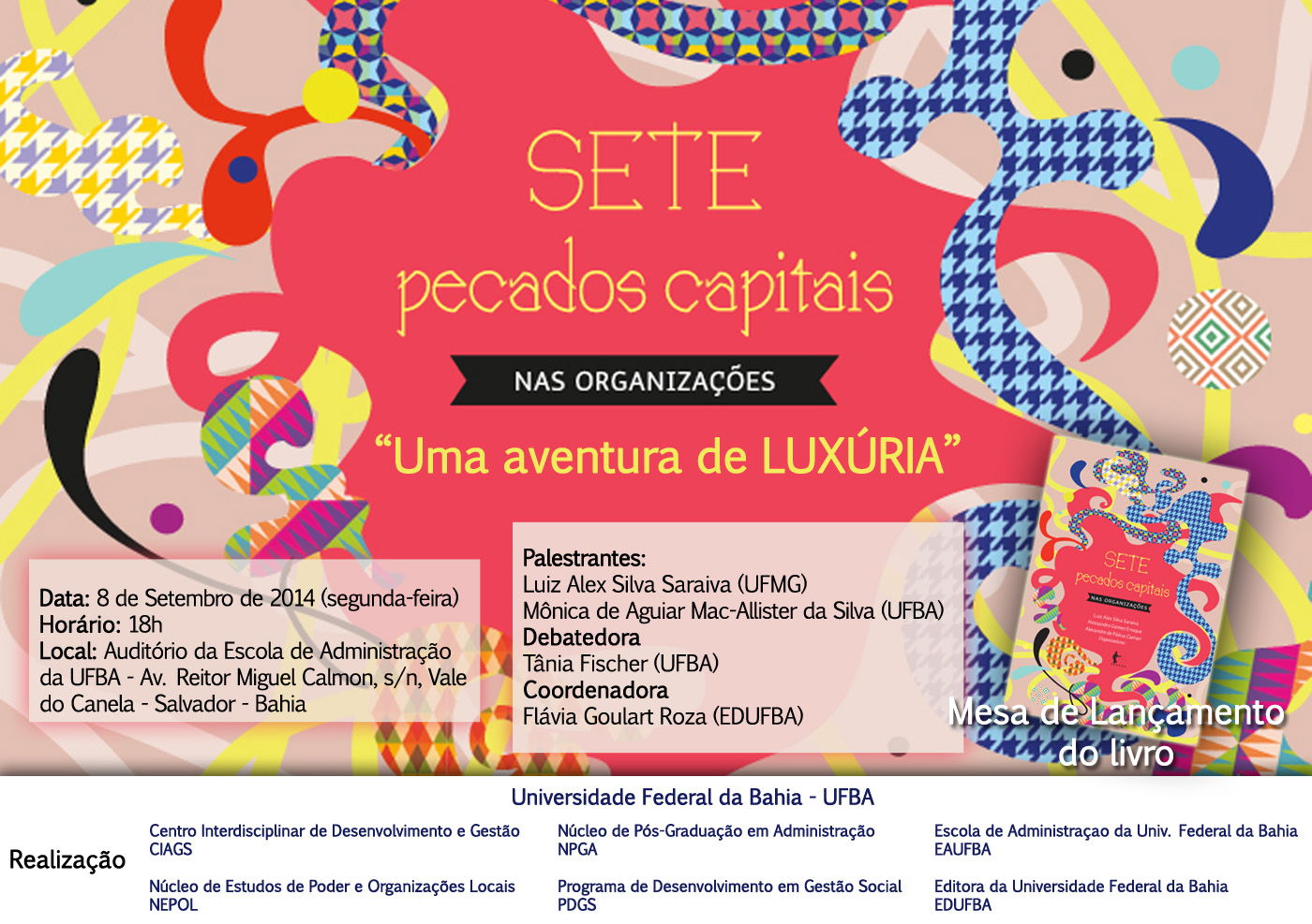 A mesa Sete Pecados Capitais nas Organizações: Uma Aventura de Luxúria é uma realização da Universidade Federal da Bahia, UFBA, e particularmente: do Centro Interdisciplinar de Desenvolvimento e Gestão Social, CIAGS, da Editora EDUFBA, da Escola de Administração, EAUFBA, do Núcleo de Estudos de Poder e Organizações Locais, NEPOL, do Núcleo de Pós-graduação em Administração, NPGA, e do Programa de Desenvolvimento e Gestão Social, PDGS.